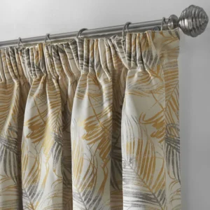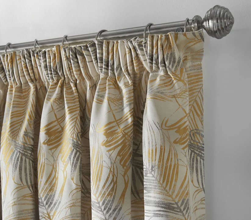 This elegant drape features a stunning Scandinavian-inspired pattern in an ochre and silver colourway over an off-white/beige backdrop.